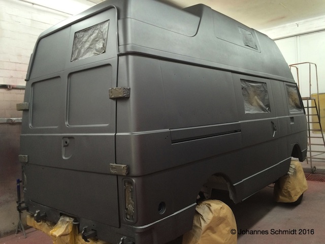 Mitte Mai und Ende Juli wurden Türen und Hochdach mit Farbe versehen. Im August Lackierung des Unterbodens und Anfertigung des Tankhalters für den Frischwassertank.