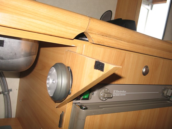 Die linke Seite liegt auf einem kleine Vierkantholz auf, welches auf der klappe der Spüle geschraubt ist.