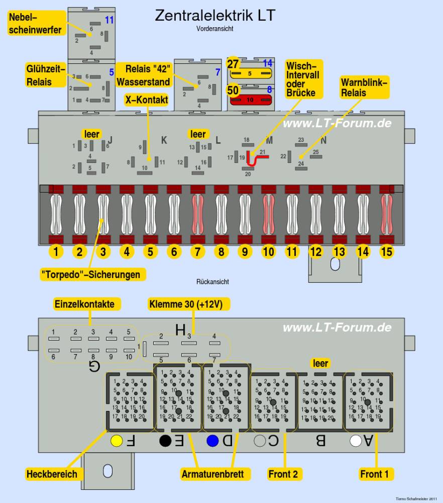 Wenn dort keine Spannung ist, miss noch, bei abgezogenem Relais, ob am Steckkontakt für die Spule, K11 (bedeutet Relaissteckplatz "K", dort das mit "11" beschriftete "Loch") Spannung ankommt. Wenn ja, ist das Relais kaputt, wenn nein, liegt ein Kontaktproblem am Stecker "D" (blau) hinten an der ZE (Zentralelektrik, der "Sicherungskasten") vor oder der ZAS (Zündanlassschalter) ha einen defekten Kontakt "X".