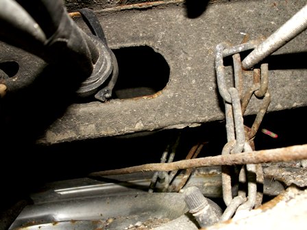 Hier erkennt man oben rechts die Gewindestange, die horizontal durch 3 Rahmenbleche gezogen wurde. An der habe ich die Kette (eine zweite, unabhängig angebrachte Sicherung ist wohl sinnvolle Vorschrift) befestigt, also einmal beidseitig einer Rahmenspange drüber und zurück durch die Felgenlöcher. Auch das Ventil ist für gelegentliches Prüfen und Aufpumpen noch erreichbar. Ein Ende der Reepschnur leuchtet noch durch, mit der die Kette gestrafft wurde. Die verrostete :roll: Stange diagonal über dem Reserverad ist der Handbremszug, der - sinnigerweise - gängig bleibt.