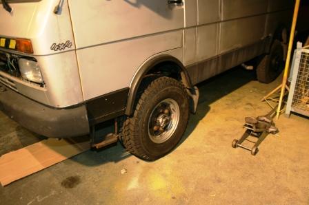 Ich habe mir letzte Woche eine FAD-Felge 8x16 mit ET-55 gekauft. Leider kann man diese Felge nicht verkehrt herum montieren und deshalb hab ich mir ein neues Felgenschloss gemacht und dieses auf ET45 eingeschweißt. Mehr an ET geht nicht, da der vordere Bremssattel sehr weit in die Felge ragt und das Tiefbett da im Weg ist. Der Reifen ist übrigens ein Mastercraft Courser AT2 in 285/75R16 mit Loadindex 119.